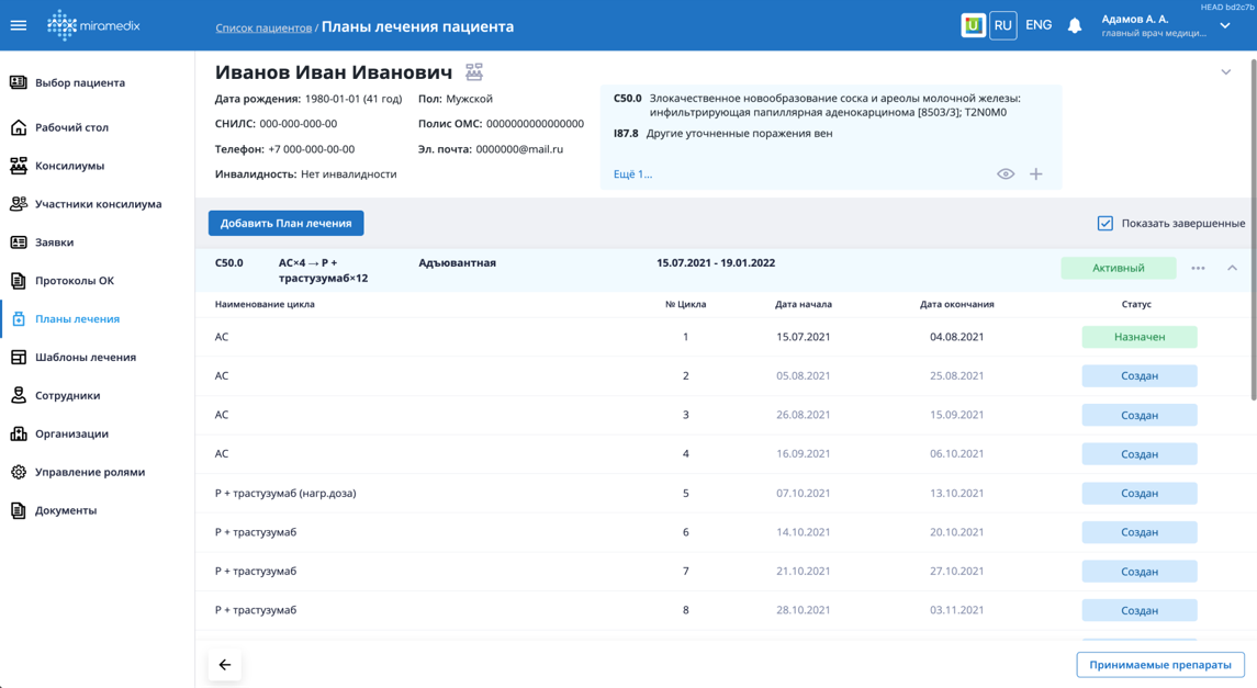 Цифровая система стандартизации процесса планирования противоопухолевой и лекарственной терапии. Включает СППВР, автоматизированный расчет дозировок, контроль исполнения плана лечения и мониторинг состояния пациента. Позволяет минимизировать риски ошибок, повысить прозрачность химиотерапии и обеспечить структурированное управление данными пациентов.